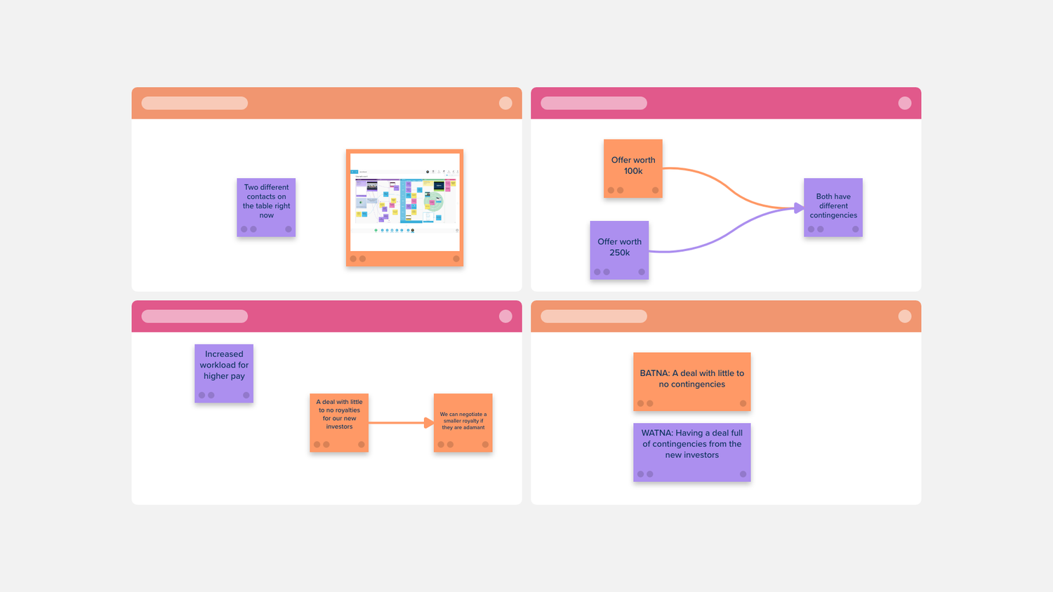 The Negotiation BATNA/WATNA Template helps you figure out the best alternative to a negotiated agreement (BATNA) and the worst alternative to a negotiated agreement (WATNA). This is important to determine before going into a negotiation, because it gives you an idea of how far you are willing to go before you need to walk away.