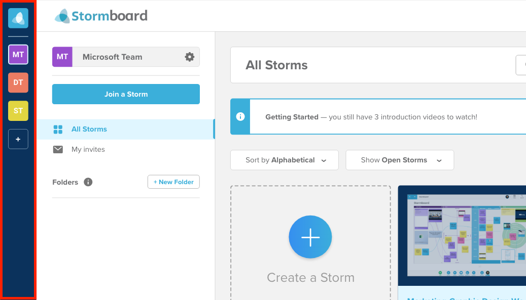 Teams that you are a member of will appear on the far left-hand side of the Dashboard. You can switch between different Teams or workspaces by clicking the square icons. The very top icon with the Stormboard logo is where your Personal Storms are located.
